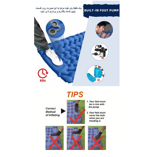 • بدون نیاز به پمپ یا تلمبه، باد شدن با فشار پا